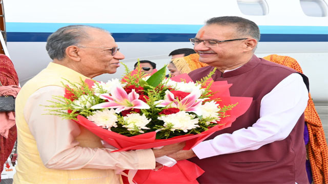 जॉलीग्रांट एयर पोर्ट पर मॉरीशस के प्रधानमंत्री का पुष्पगुच्छ भेंट कर उनका स्वागत करते कैबिनेट मंत्री गणेश जोशी।