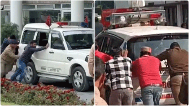सीएम फ्लीट में लगी इंटरसेप्टर को धक्का लगाते पुलिस और कर्मचारी.